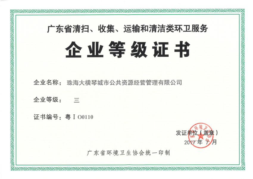 我司作為橫琴新區市政道路環衛服務單位,始終堅持“讓城市更精彩”的發展理念,以為新區的發展建設保駕護航、呈現靚麗的市容市貌為己任。為進一步提高我司環衛服務水平,我司積極申報該項評定工作,在歷經申請報名、資料提交、接受專家現場考核等三個多月的準備工作后,我司順利通過“2017年第一批廣東省環衛服務企業等級評定”工作,并獲得三級企業等級的認定。