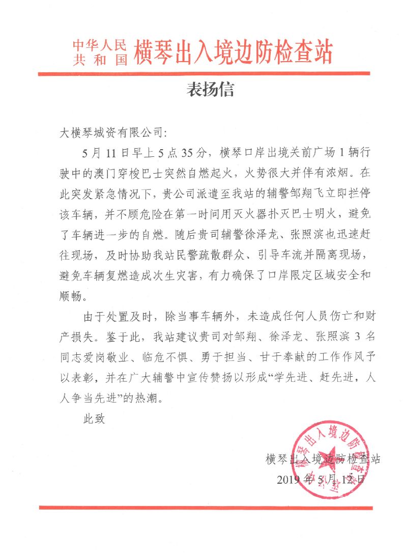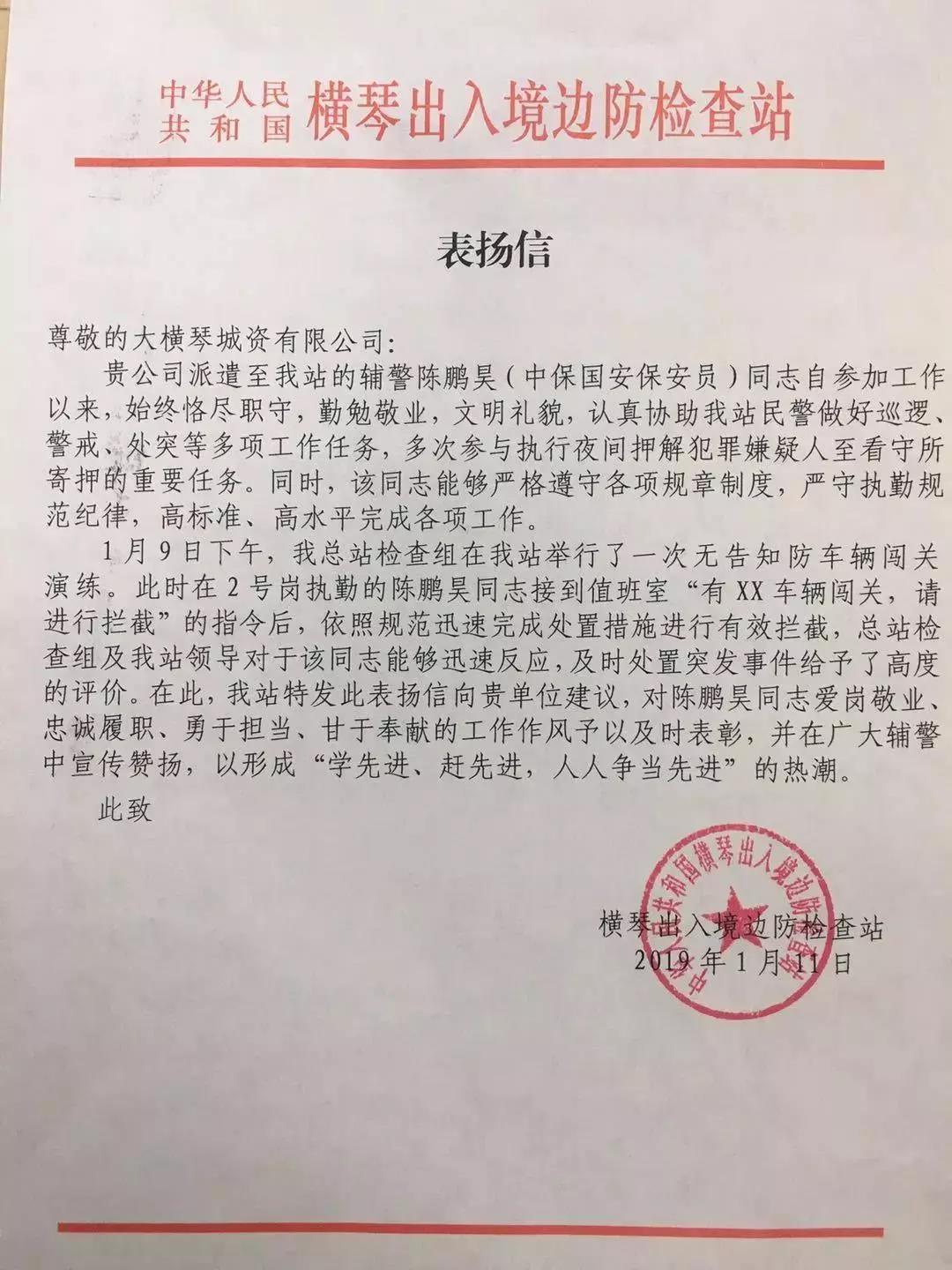 橫琴出入境邊防檢查站特發(fā)來(lái)表?yè)P(yáng)信一封,贊揚(yáng)三名輔警愛(ài)崗敬業(yè)、臨危不懼、勇于擔(dān)當(dāng)、甘于奉獻(xiàn)的精神。而早在今年一月份時(shí),大橫琴城資的輔警陳鵬昊也曾因?yàn)槌錾墓ぷ鞅憩F(xiàn)收到表?yè)P(yáng)信。