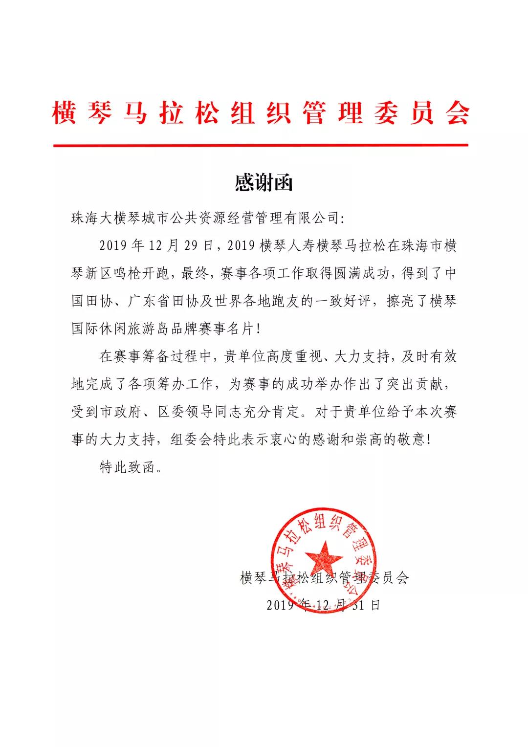 一封來(lái)自橫琴馬拉松組織管理委員會(huì)的