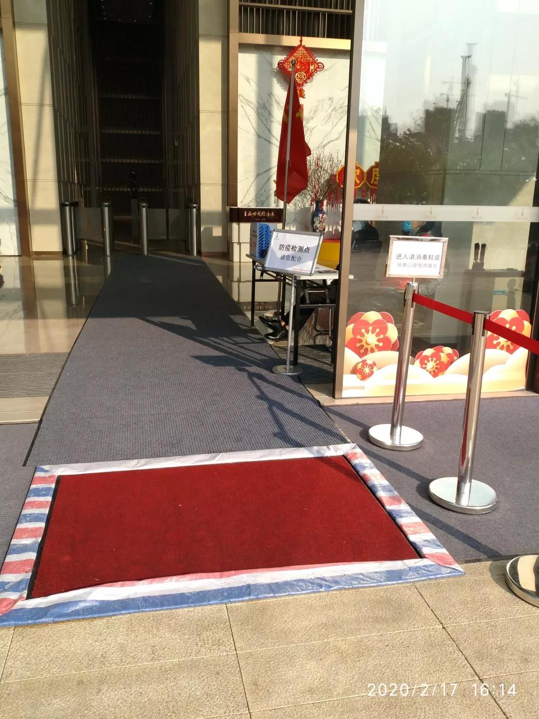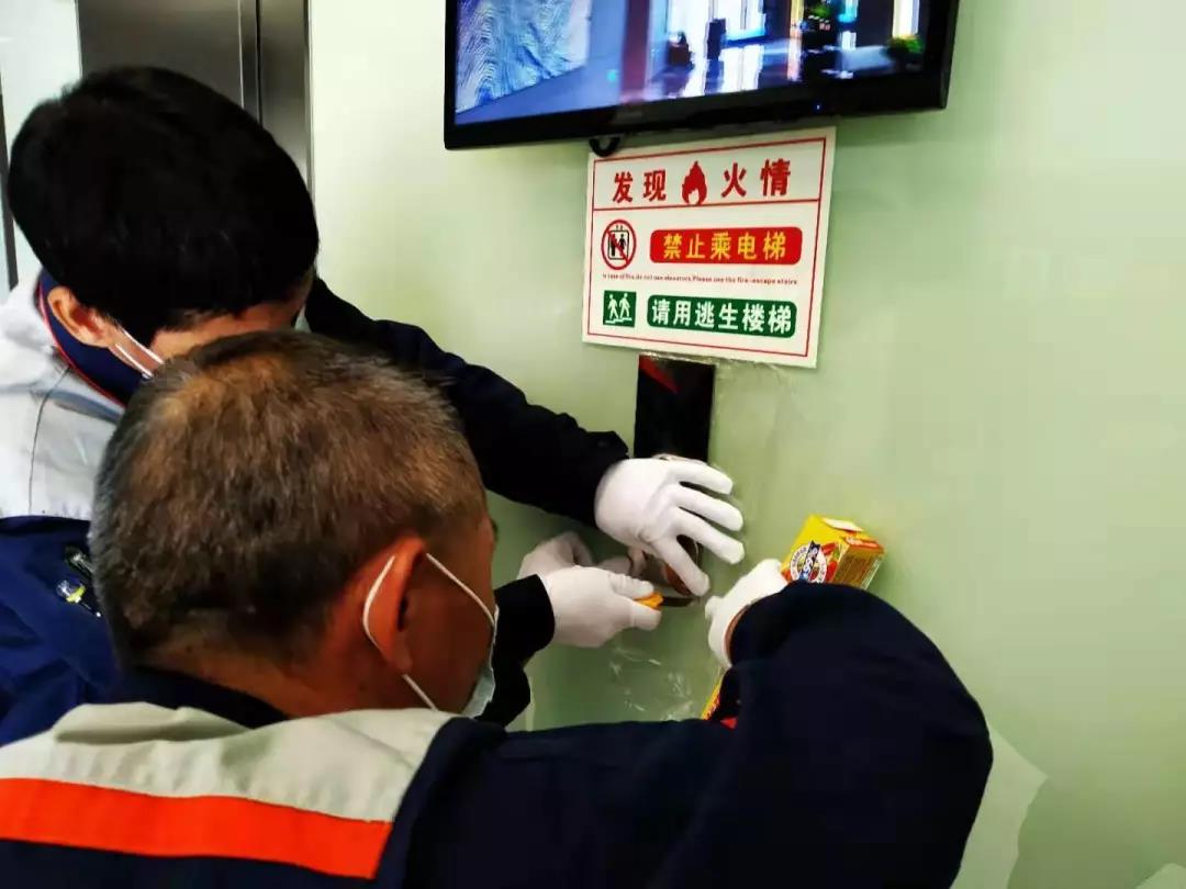 每天對(duì)大廈開展全方位無死角消毒。增加電梯、地面四周、大堂閘機(jī)、洗手間、門把手、外圍垃圾桶、排水溝、地下車庫等高頻率接觸點(diǎn)的清潔、消毒頻次,同時(shí)為避免造成交叉感染,在大廈電梯廳增設(shè)客用紙巾取用點(diǎn),在電梯按鈕和大堂閘機(jī)上張貼保鮮膜,保鮮膜每天會(huì)更換3-5次,更換過程中均會(huì)使用84消毒液進(jìn)行消毒。