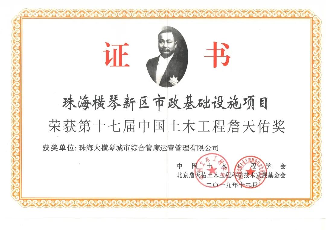2019年12月,大橫琴管廊公司作為運維單位榮獲第十七屆中國土木工程詹天佑獎。