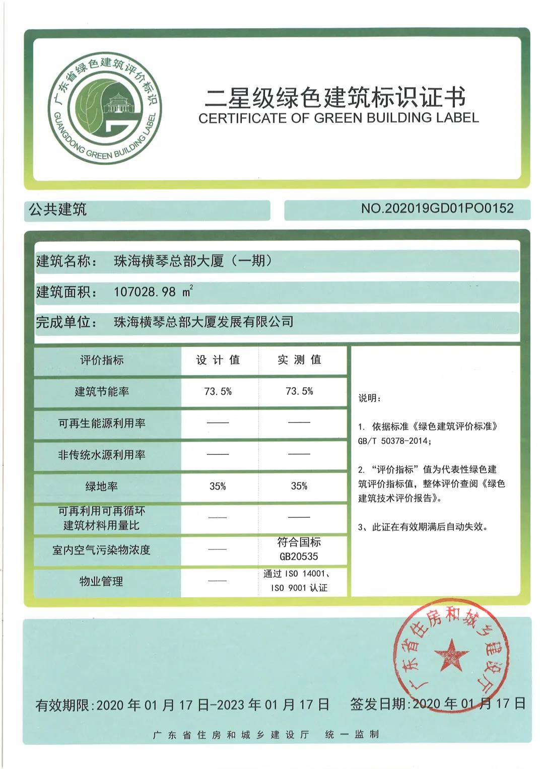 2020年1月17日,由大橫琴城資提供物業(yè)服務的橫琴總部大廈成為珠海市首個獲得綠色建筑二星級運行標識認證的超高層辦公樓。
