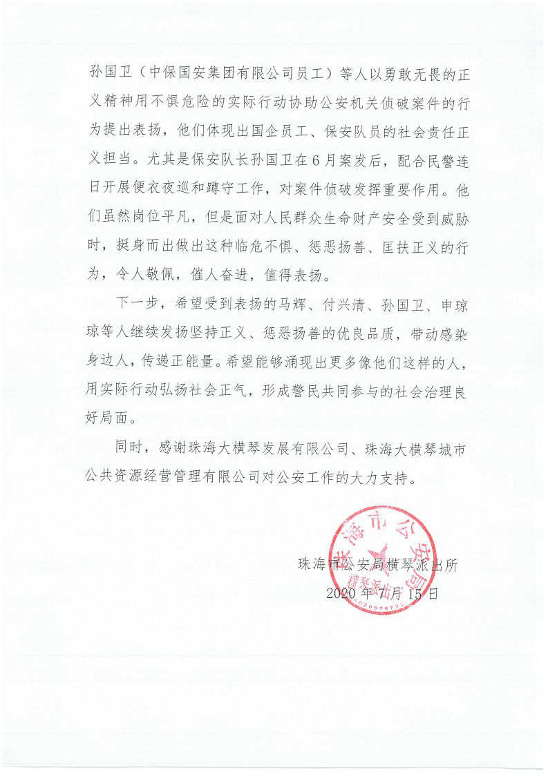 珠海市公安局橫琴派出所對馬輝、申瓊瓊、付興清、孫國衛等人勇敢無畏地協助公安機關偵破案件的行為提出表揚。