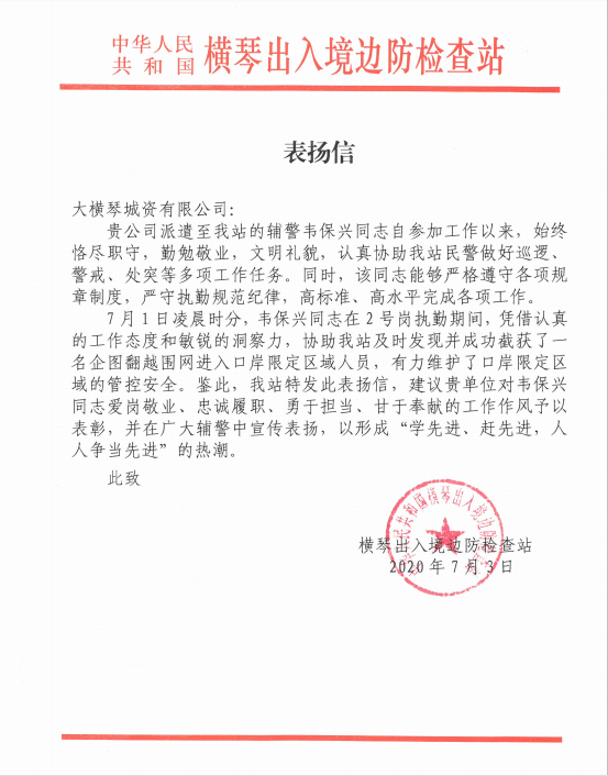 橫琴出入境邊防檢查站發來表揚信,對韋保興愛崗敬業、勇于擔當、甘于奉獻的工作作風提出表揚。