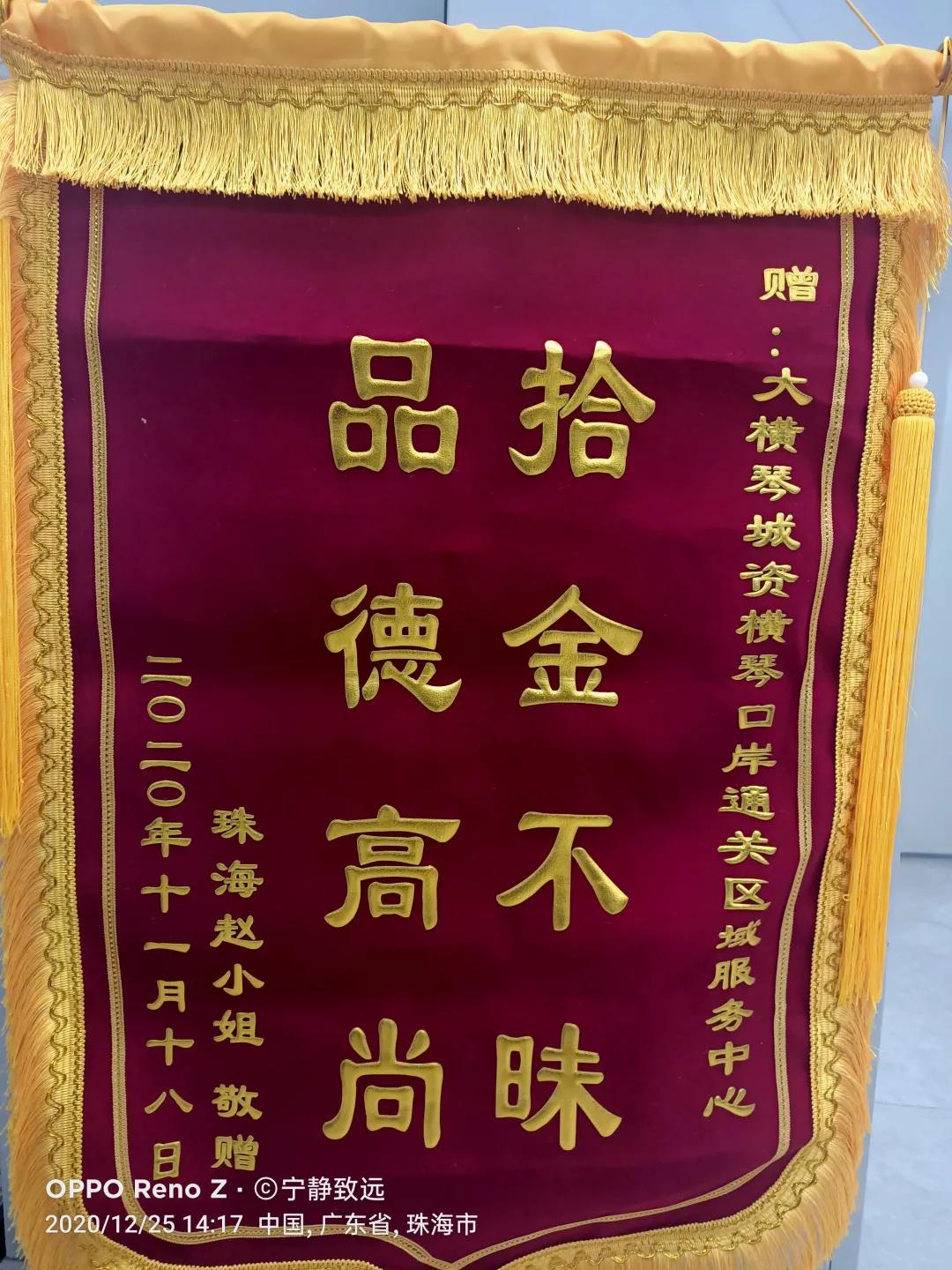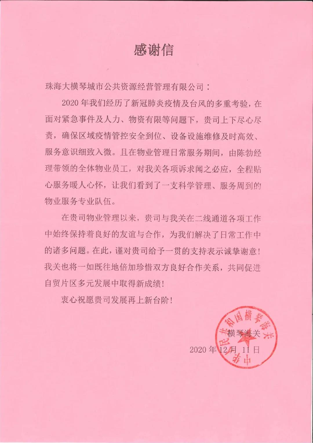 2020年12月,橫琴海關就優質的物業服務質量贈與二線通道管理中心印有“精誠服務,情系海關”的錦旗一面及感謝信一封,以示感謝。