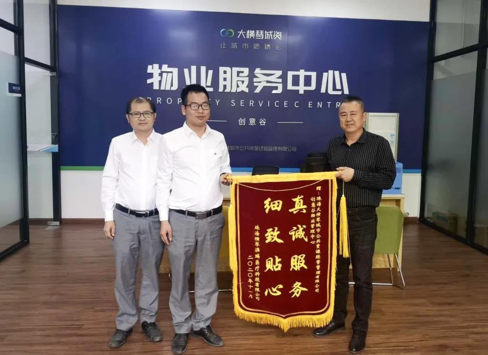 2020年11月,珠海橫琴澳瑞醫療科技有限公司為橫琴?澳門青年創意谷項目頒發印有“真誠服務,細致貼心”的錦旗,對物業人員細致、熱心的服務表示感謝。