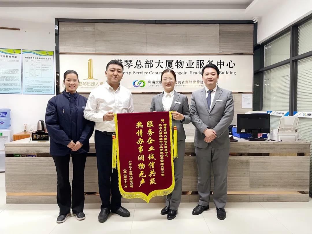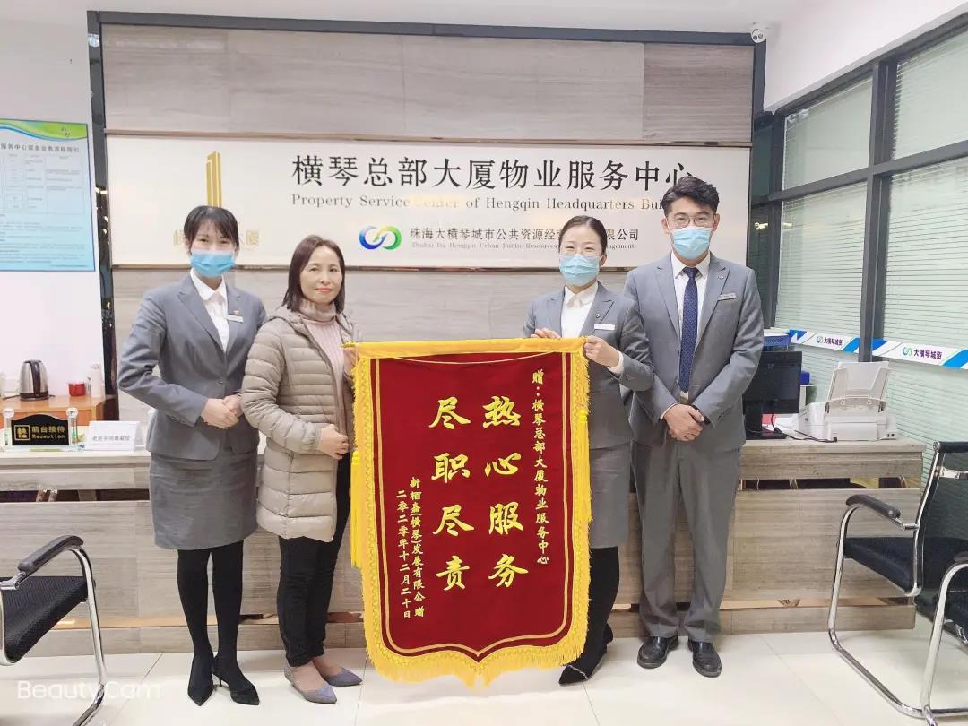 2020年12月,新栢嘉(橫琴)發展有限公司送來印有“熱心服務,盡職盡責”的錦旗與慰問品,感謝過去一年,橫琴總部大廈物業服務中心全體員工的盡心服務。