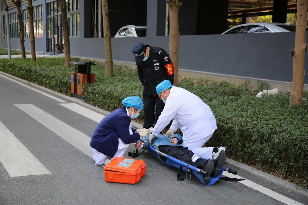 搶救組成員將“受傷人員”抬到安全地點做應急包扎,救護車抵達現(xiàn)場,急救中心人員對沒有呼吸的“傷員”進行心肺復蘇。