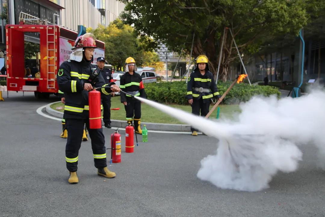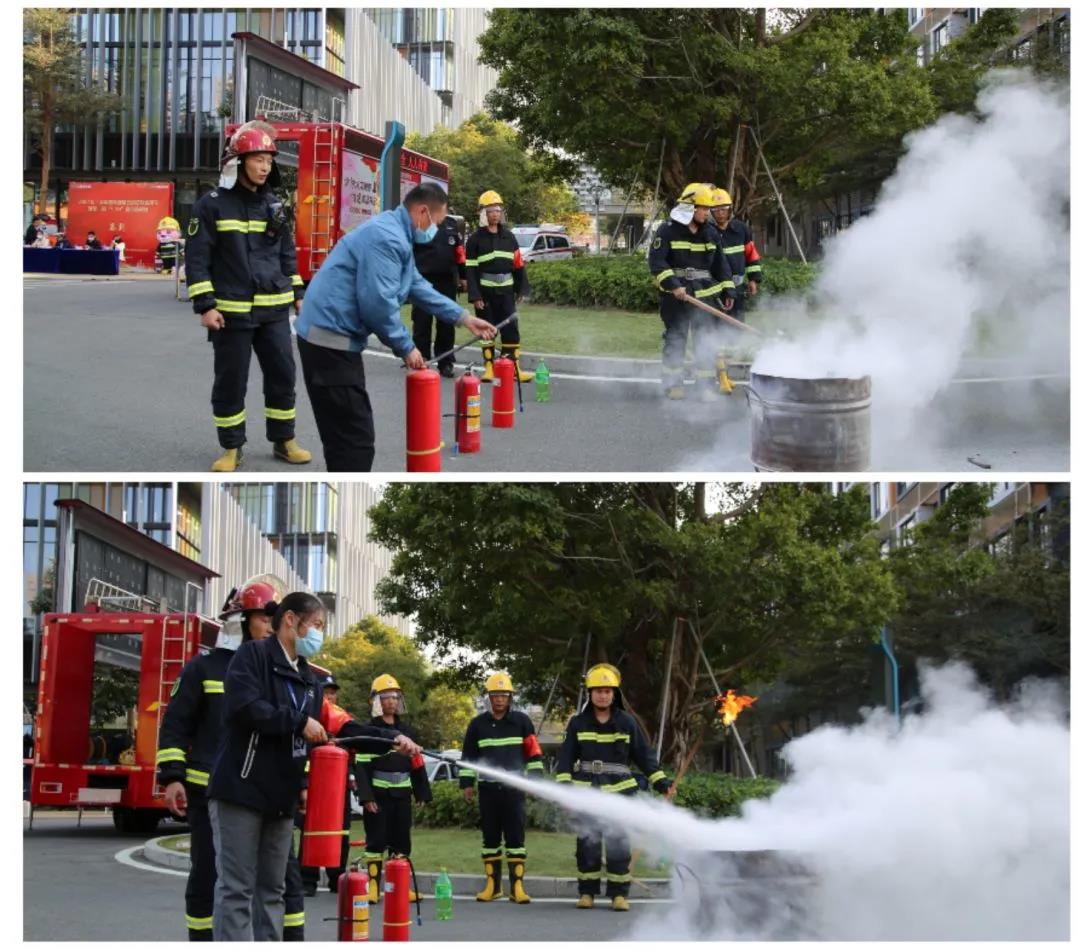 園區(qū)客戶、物業(yè)服務中心員工現(xiàn)場嘗試使用滅火器滅火