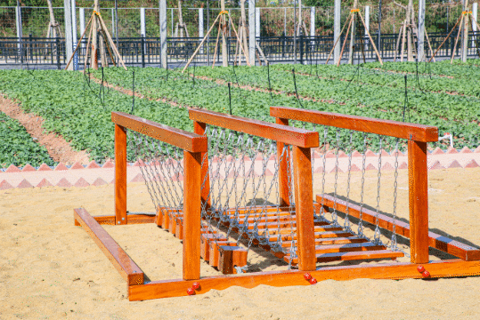 橙子開心農(nóng)場內(nèi)設(shè)蹺蹺板、長椅、秋千等娛樂設(shè)施