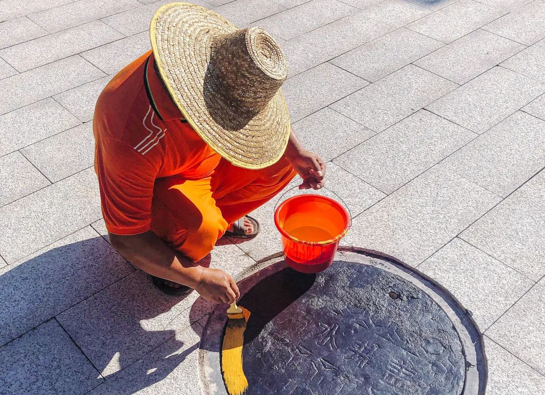 ▲在井蓋上涂刷黃色油漆,起到安全警示作用