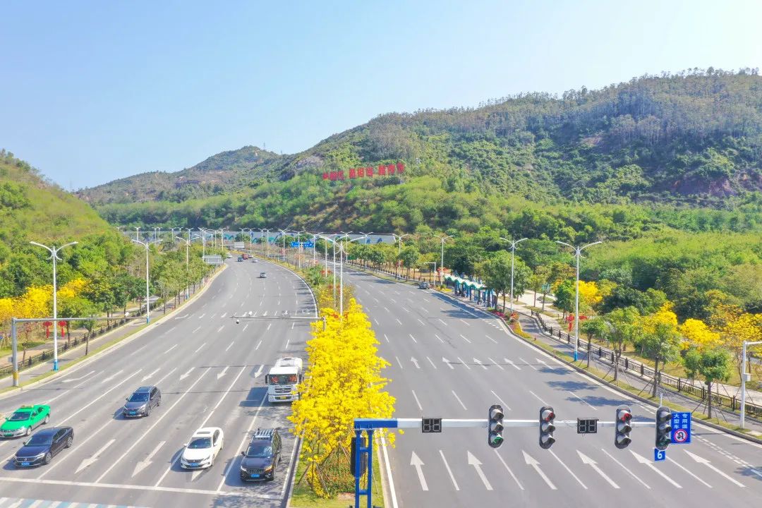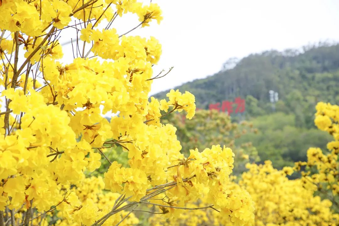 橫琴口岸周邊,黃花風鈴木掛滿枝頭,用成片綻放的金黃奏響春的旋律。