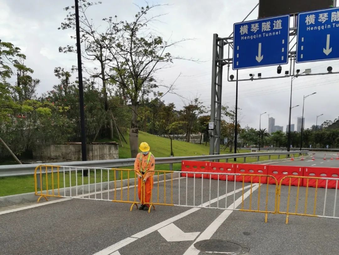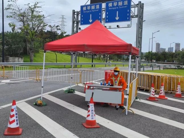 在橫琴隧道出入口,大橫琴城資積極配合交警部門對橫琴隧道實行交通管制并在橫琴隧道東線匝道入口和西線匝道出口會車位置協助開展道路引流工作。