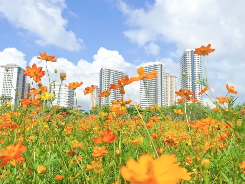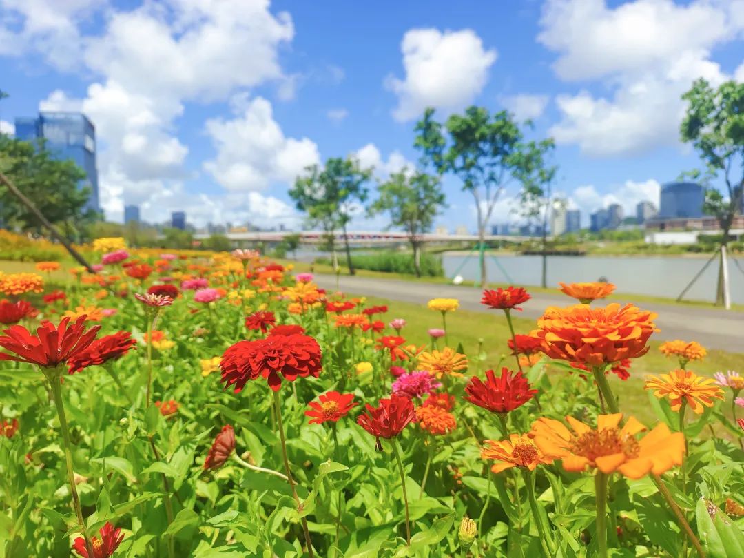 今年5月初,在橫琴粵澳深度合作區城市規劃和建設局指導下,大橫琴城資在橙子開心農場、橫琴花海長廊、天沐河碧道等地開展景觀營造工作,共計種植了約42000m²的硫華菊、11000m²的大花百日草、10000m²的千日粉,經過一段時間的精心養護后,各色花海均已進入盛花期。