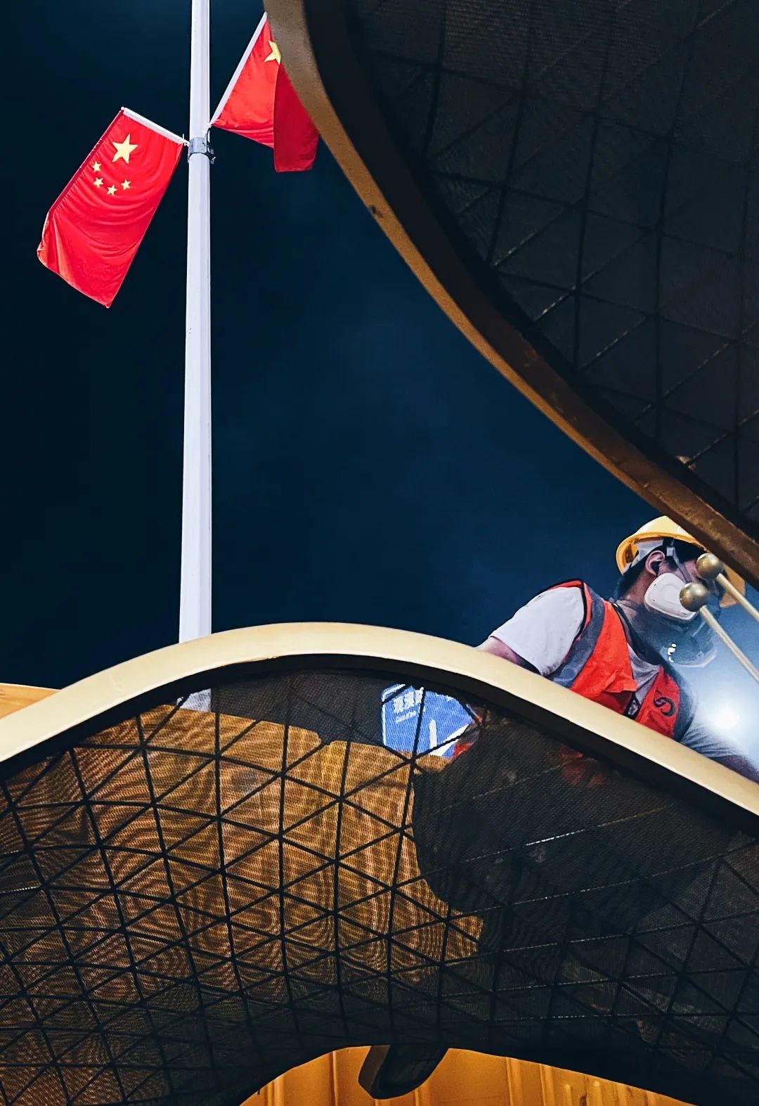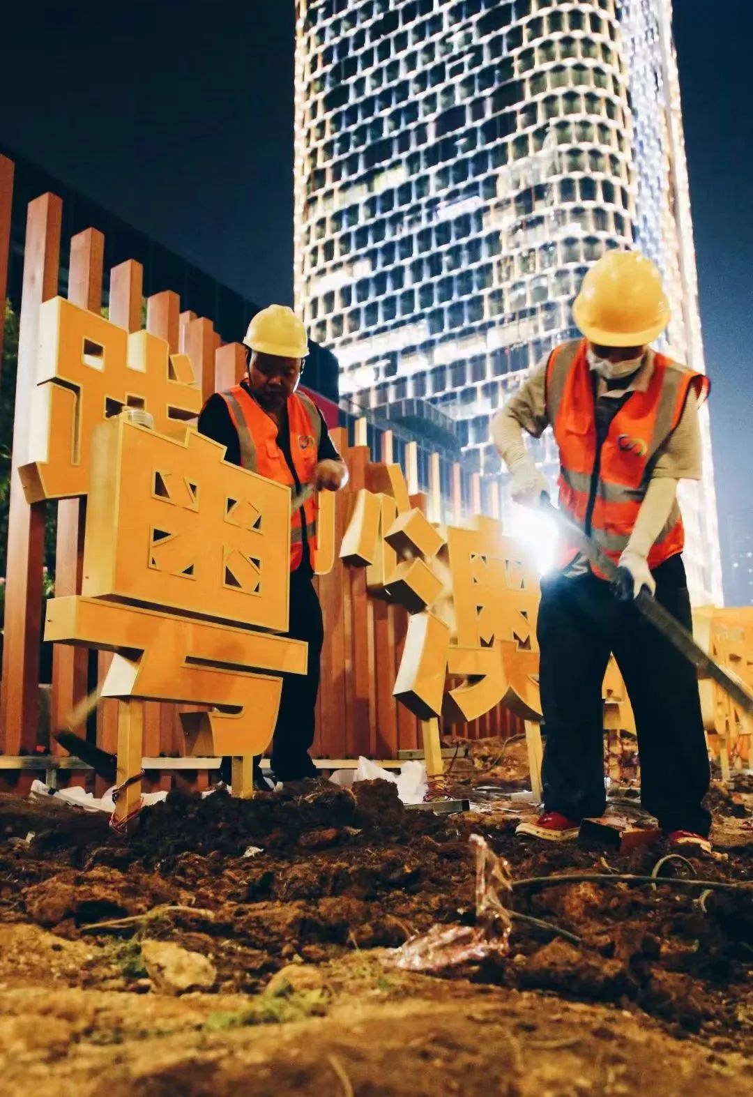 從白天到黑夜,為了呈現(xiàn)最佳的造景效果,工作人員徹夜趕工,用“橙”意服務(wù)獻(xiàn)上對合作區(qū)的真摯祝福。
