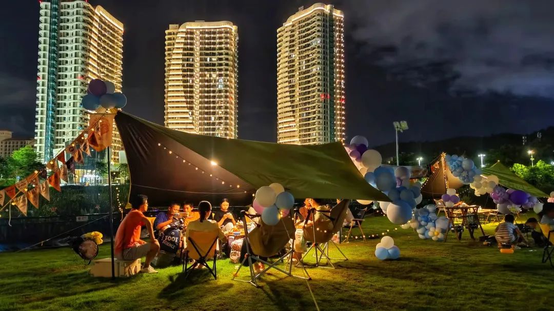 ▲居民在橙子開心農場的草地上搭好帳篷、支起天幕,體驗露營的樂趣