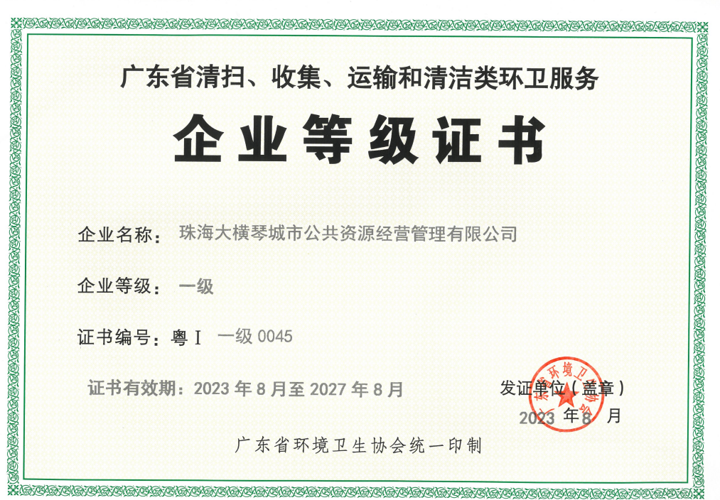 此次獲評“清掃、收集、運輸和清潔類環衛服務企業”一級評定,既是對大橫琴城資服務能力的高度認可,也是激勵和鞭策。