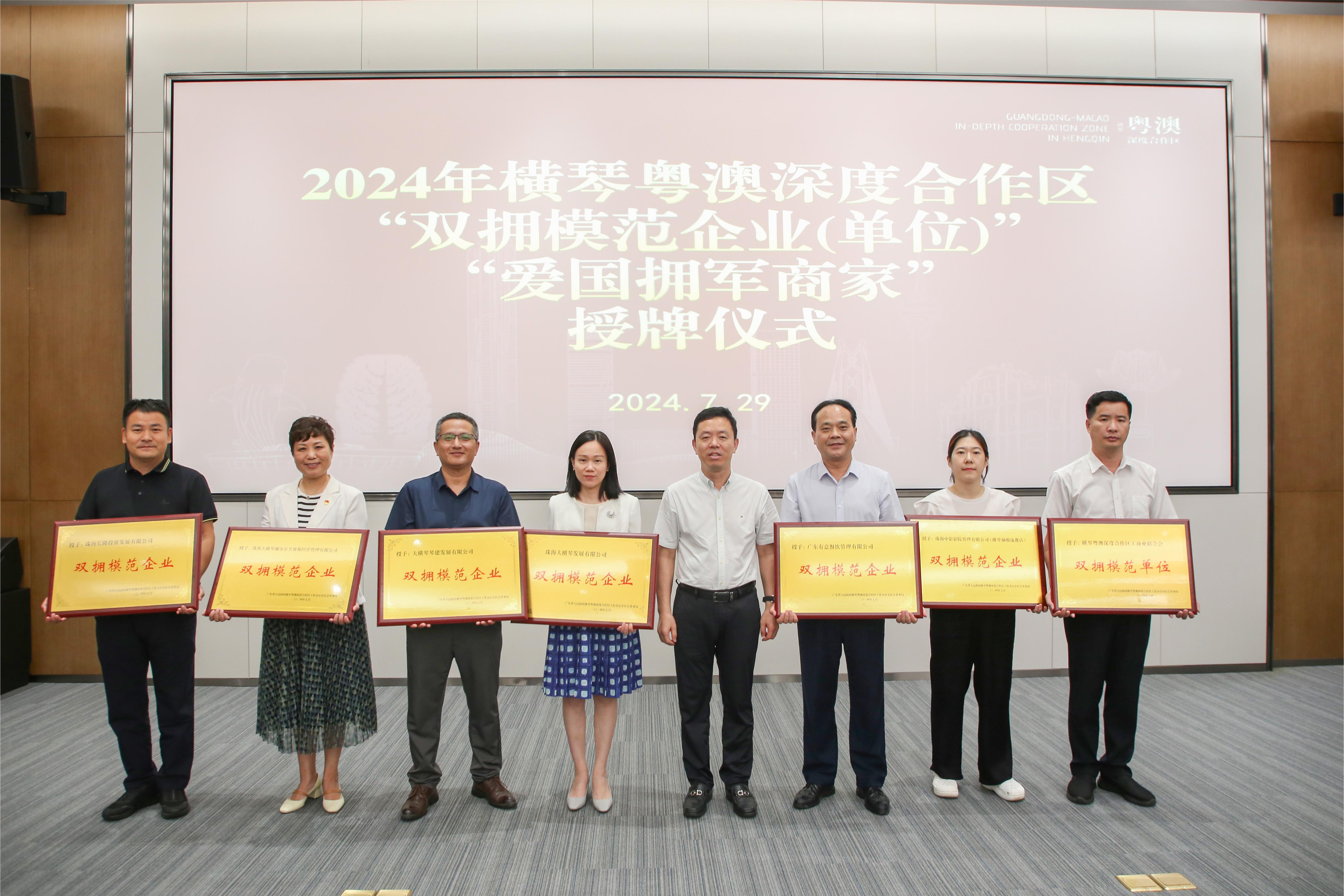 7月29日,在第97個“八一”建軍節來臨之際,合作區舉辦首次“雙擁模范企業”“愛國擁軍商家”授牌活動。省委橫琴工委委員、省橫琴辦副主任葉真,省橫琴辦各處局、橫琴法院、橫琴檢察院、橫琴公安局,執委會各局,橫琴稅務局、各社區、各駐島軍警部隊負責人,各企業代表共90余人參加了活動。