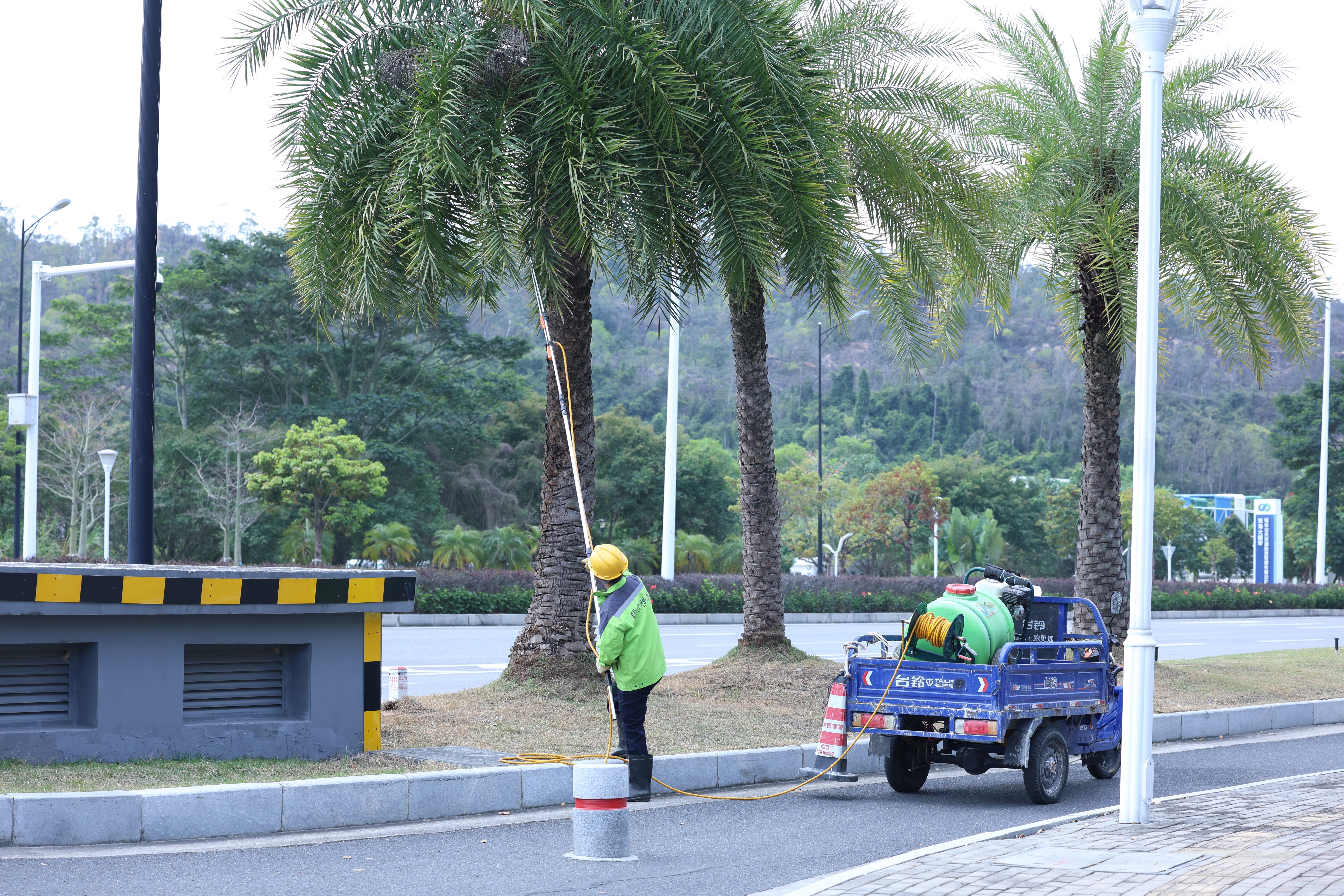春季是病蟲害高發期,為保障環島西路、長隆大道等道路上的棕櫚科喬木健康生長,養護人員采用“人工噴藥防治+掛甲刻藥包”的雙重防護模式,精準防治病蟲害。在確保防治效果的同時,盡可能減少藥物對生態環境的影響。